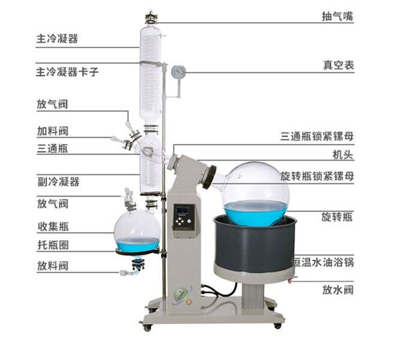 蒸馏烧瓶,但具有标准研磨口接口的梨形或圆形底烧瓶通过高度回流蛇形冷凝器管与减压泵连接,回流冷凝器管与研磨瓶连接,用于接收蒸发的有机溶剂。在冷凝管与减压泵之间有13通活塞,当体系与大气相通时,可以将蒸馏烧瓶,接液烧瓶取下,转移溶剂,当体系与减压泵相通时,则体系应处于减压状态。使用时,应先减压,再开动电动机转动蒸馏烧瓶,结束时,应先停机,再通大气,以防蒸馏烧瓶在转动中脱落。作为蒸馏的热源,常配有相应的恒温水槽。