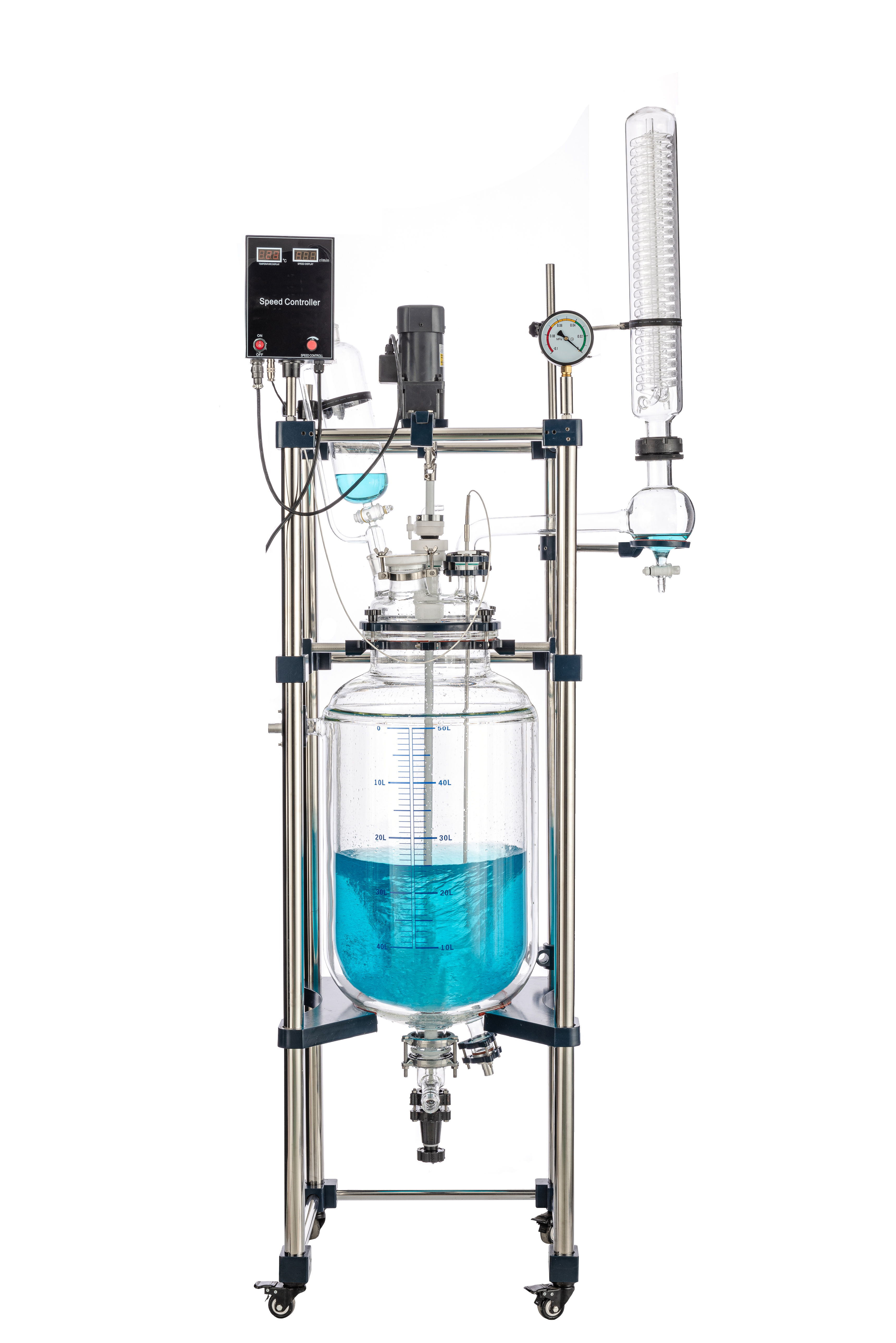 双层玻璃反应釜是常用的生化仪器,被现代精细化工、生物制药、科研实验等行业所选用,可在恒速、恒力、恒温的条件下做浓缩、蒸馏、回流、分离、提纯反应,是教学、实验、中试、生产的理想仪器设备。