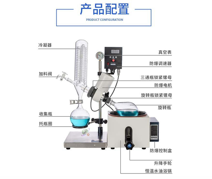 2.旋转蒸发瓶:旋转蒸发瓶用于盛装待蒸发的溶液。在电机的驱动下,蒸发瓶的旋转使溶液在瓶内形成薄膜,有利于在加热和减压的条件下进行高效蒸发。