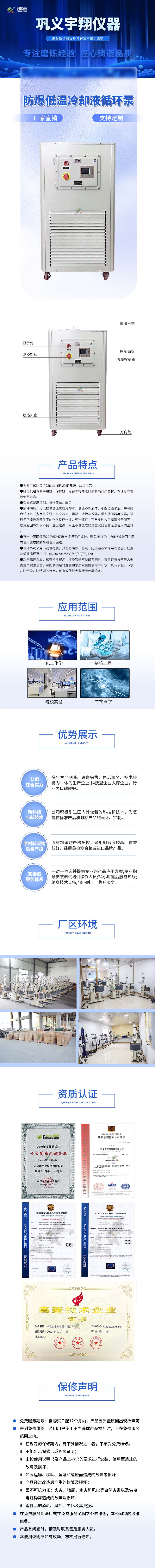 采用压缩制冷方法的防爆低温冷却液循环泵设备,可直接冷却试管、反应瓶等进行低温下的化学反应,进行化学品和生物制品低温贮存,也可结合旋转蒸发仪、真空冷冻干燥箱、循环水式多用真空泵等配套使用。
